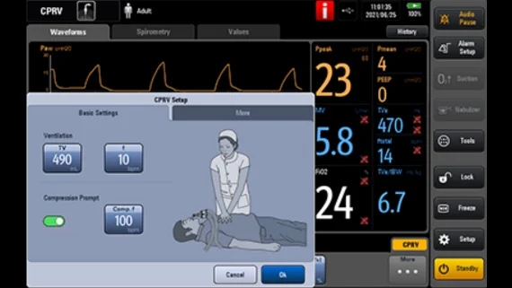 CPRV TM специально разработан для проведения сердечно-лёгочной реанимации. Быстрый доступ к режиму с запуском в один клик, обеспечивающий точную вентиляцию и мониторинг уровня CO2. При использовании с уникальным электронным пороговым устройством Mindray (e-ITD TM ) технология может ещё больше повысить эффективность сердечно-лёгочной реанимации за счёт увеличения венозного возврата и перфузии.