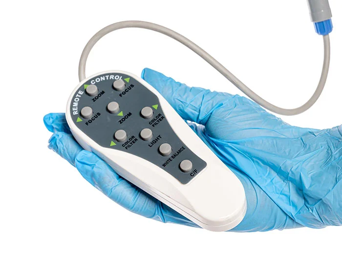 Эргономичный проводной пульт, подключаемый непосредственно к оптической головке, дает быстрый доступ к основным функциям: регулировке увеличения, сдвигу точки фокуса, управлению цветовыми фильтрами и моментальной фотофиксации. Для полного соблюдения стерильности и удобства опционально доступен ножной переключатель. Он позволяет освободить руки врача для проведения манипуляций.